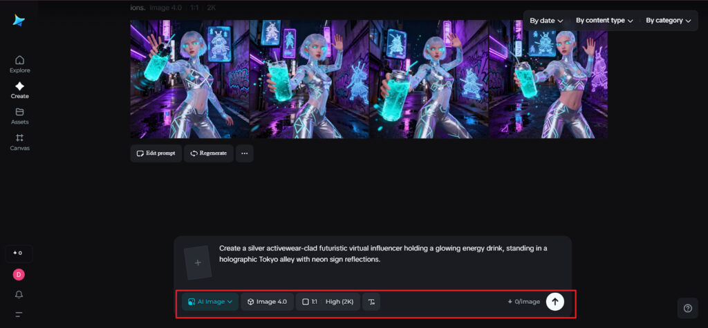 Let’s say you write: a silver activewear-clad futuristic virtual influencer holding a glowing energy drink, standing in a holographic Tokyo alley with neon sign reflections.