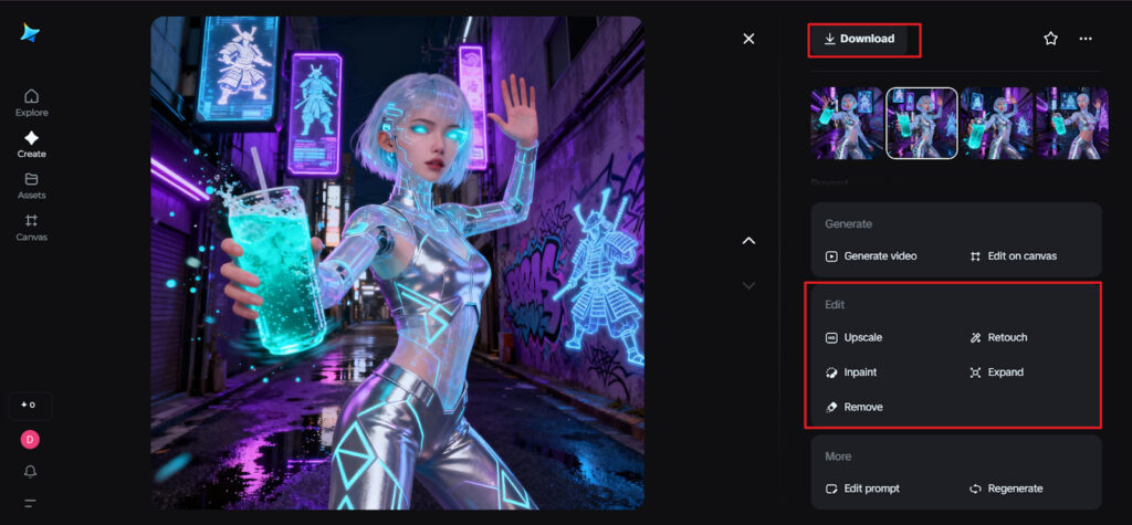 Once your image is finished, use Dreamina’s AI editing tools: retouch to enhance details, expand to reveal a scene, remove to tidy up, and inpaint to add things. Once you’re satisfied with the output, click “Download” to save it. You now have a visual set for campaigns, concept decks, or virtual influencer partnerships.