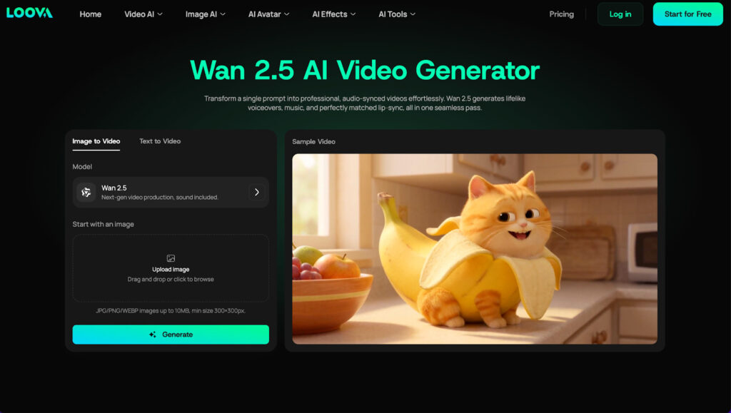 Test results: When tested in Loova, Wan 2.5 provided crisp, realistic voiceovers. The voice synchronization was seamless, which made it ideal for content creators who need high-quality narration but don’t have access to voice actors.