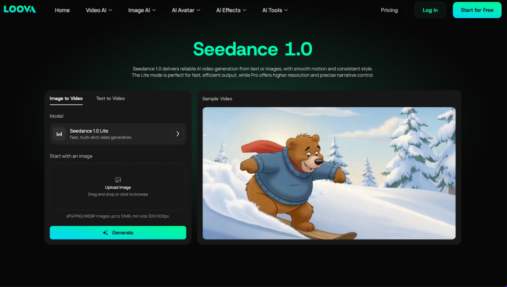 Newly integrated into Loova, Seedance 1.0 Pro brings AI-powered movement generation to the table. This model is perfect for creating movements for avatars or animated characters. Whether you’re creating content for music videos, advertisements, or gaming content, Seedance 1.0 Pro can generate fluid, realistic dance sequences based on your input.